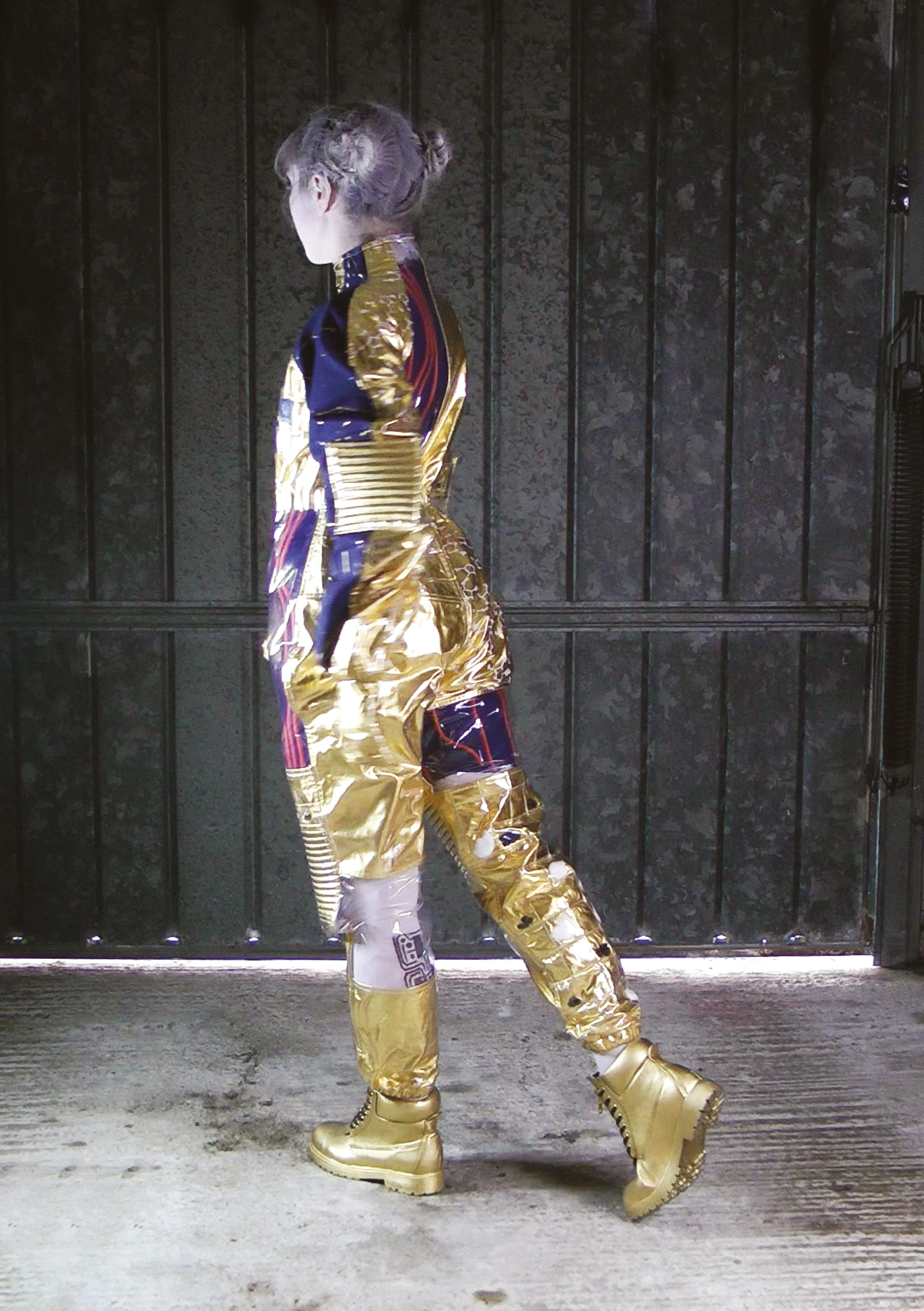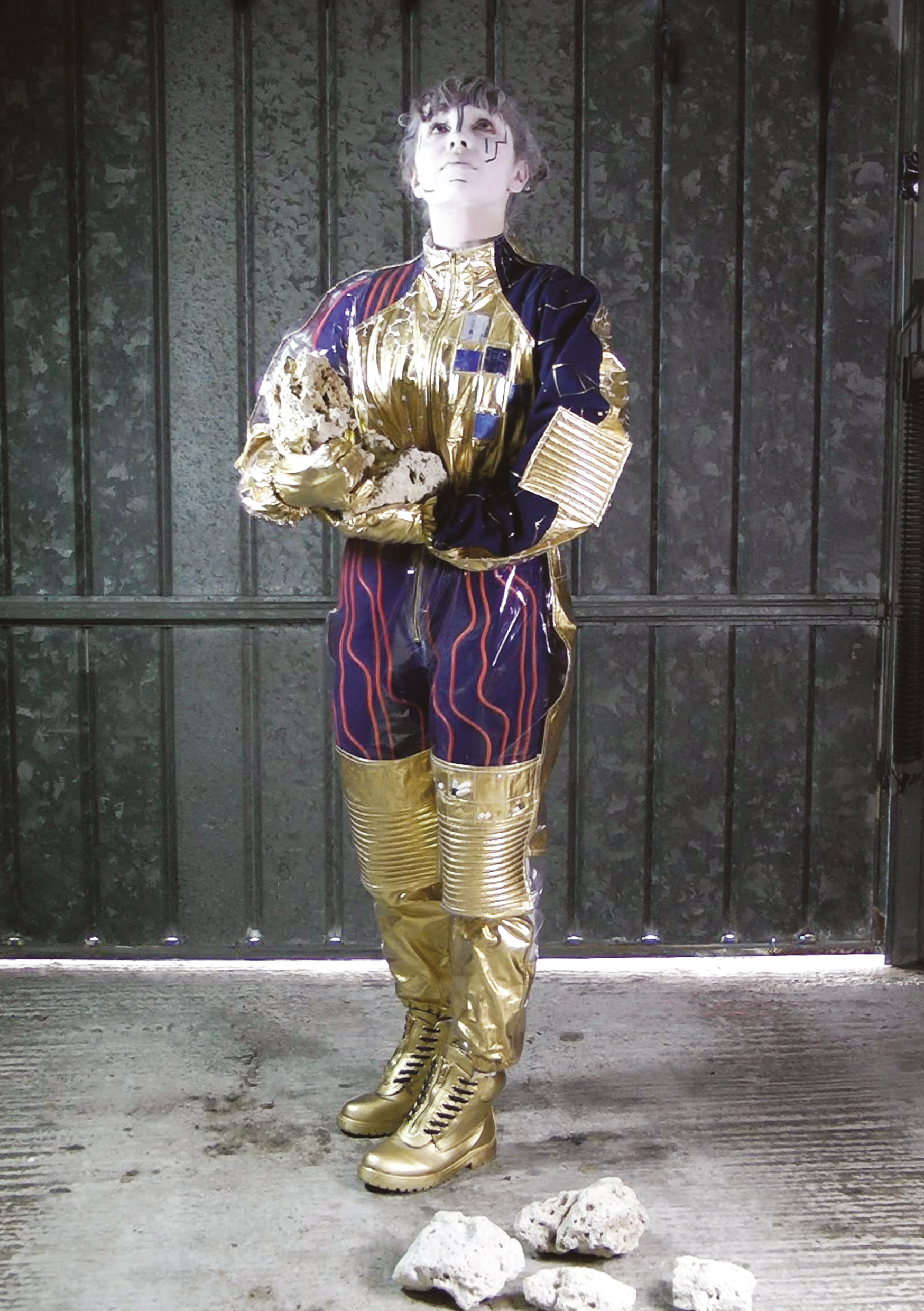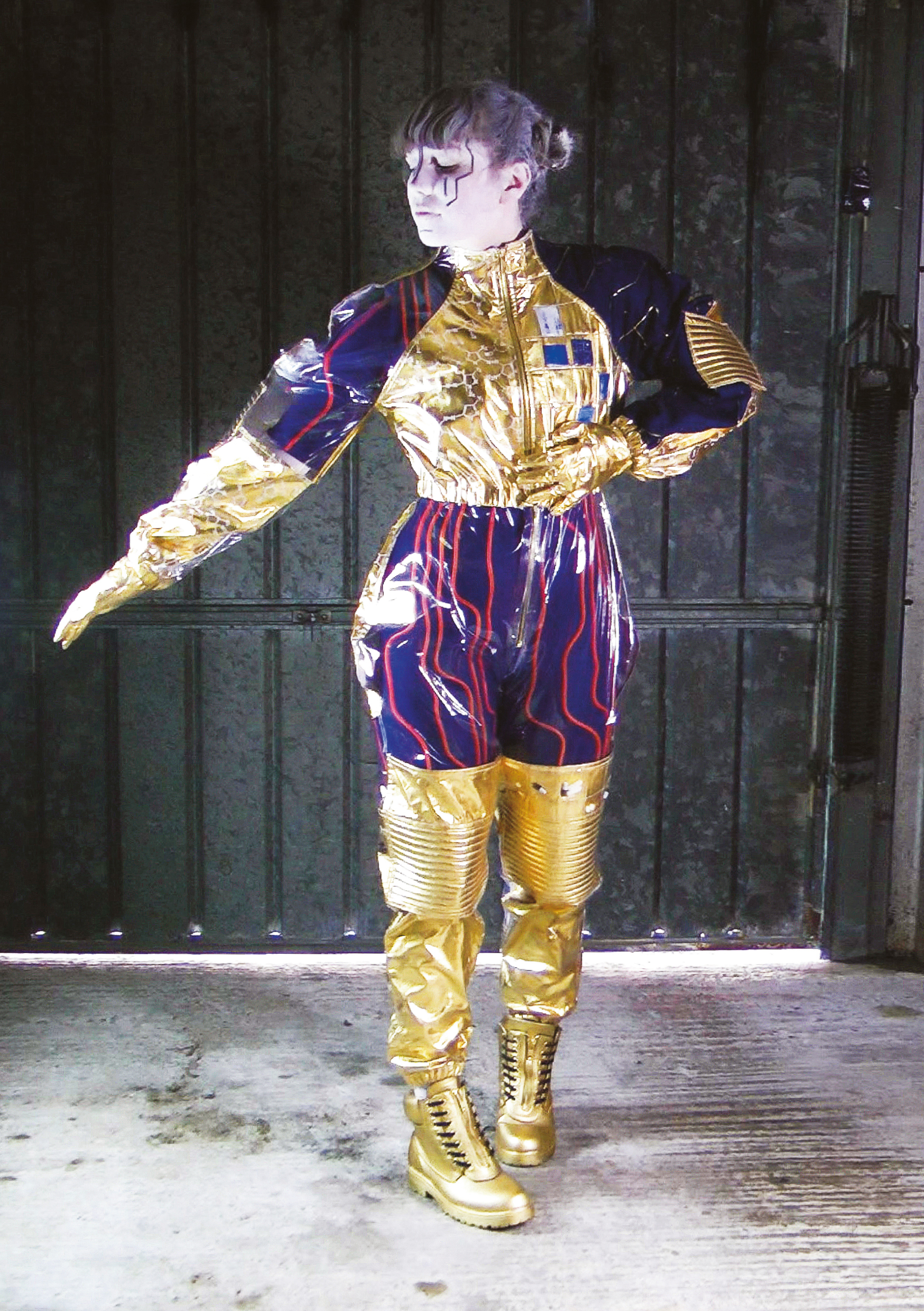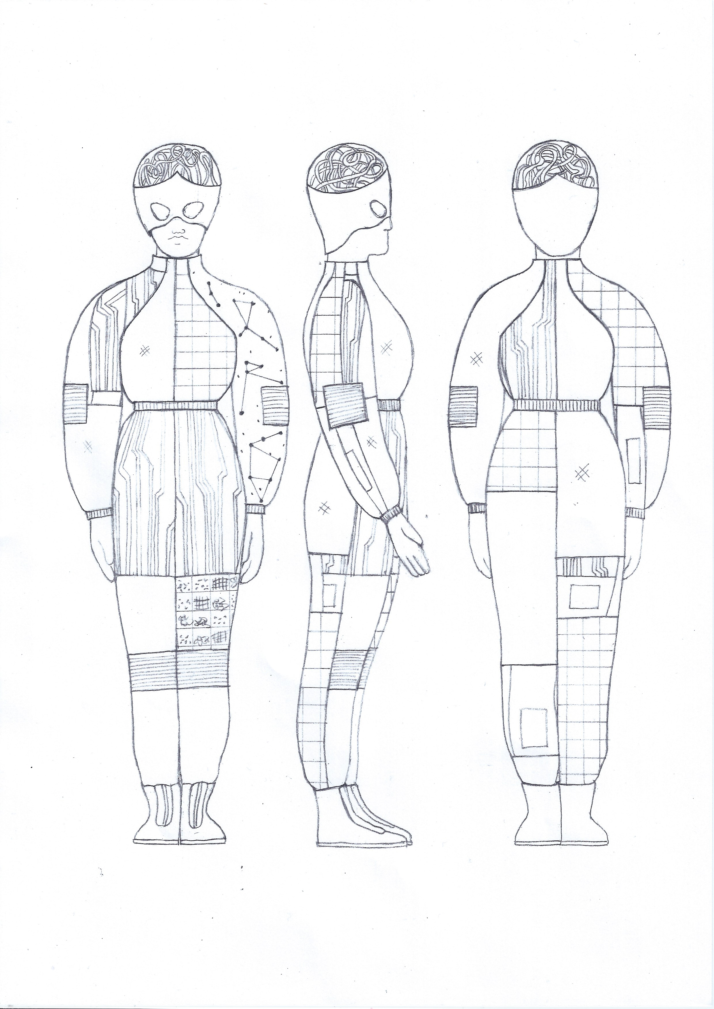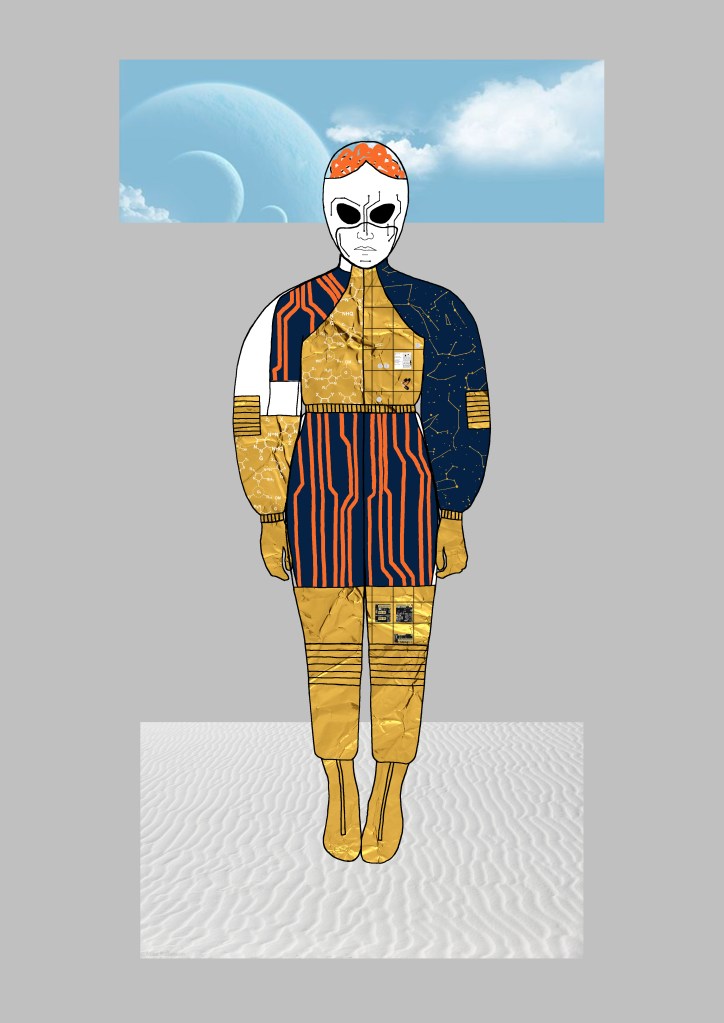 For this project from the 3rd year of my degree, we had to create an original conceptual character around the theme of “migration”. I chose to design a human-alien hybrid from the future, travelling from a dystopian and decaying Earth to find a new home on a new planet. My character has to carry all that she needs within her spacesuit: blueprints, maps, medications, seeds and technology. I pattern cut, screen printed, embroidered, piped, quilted and constructed this costume myself. 2016 – 2017.