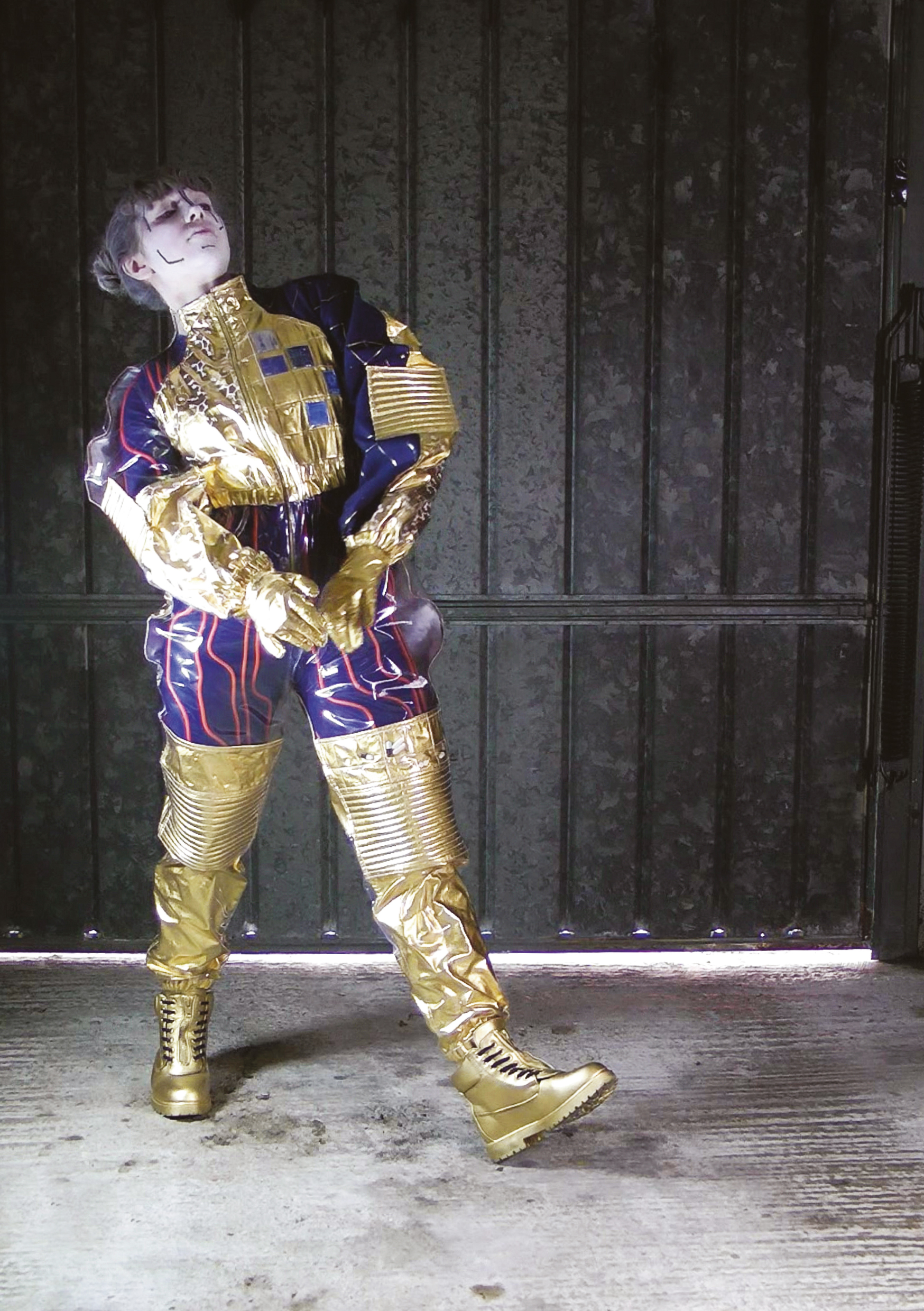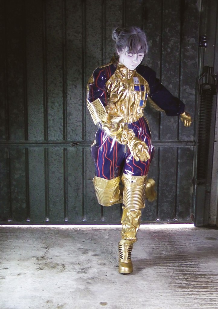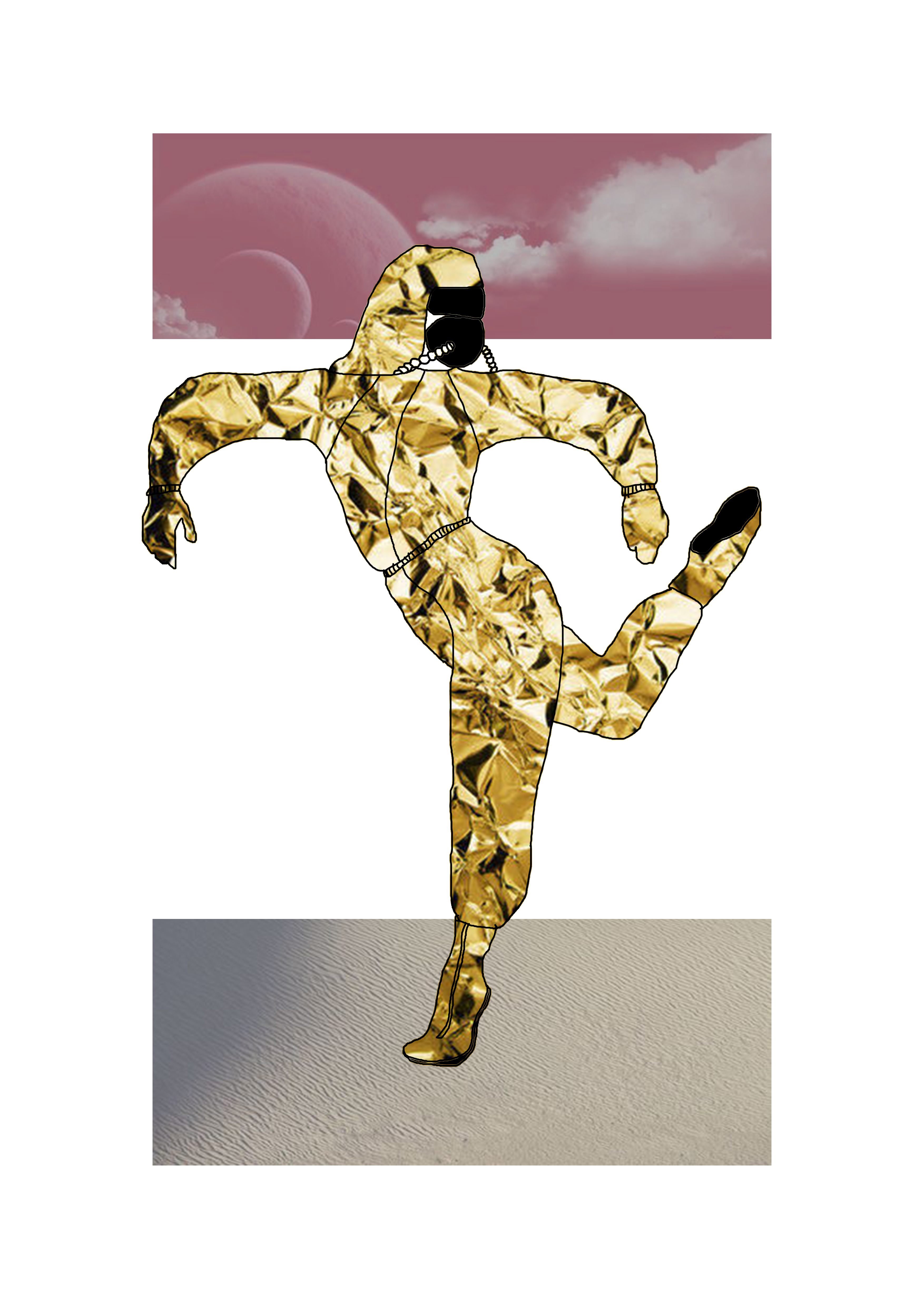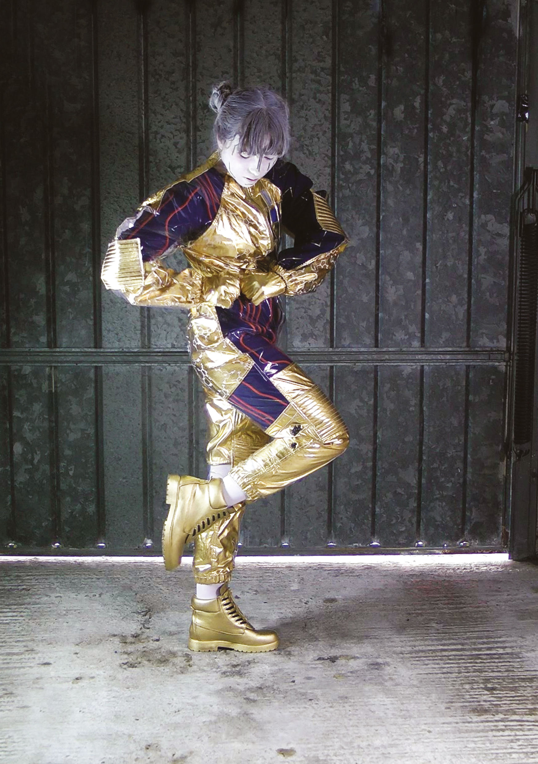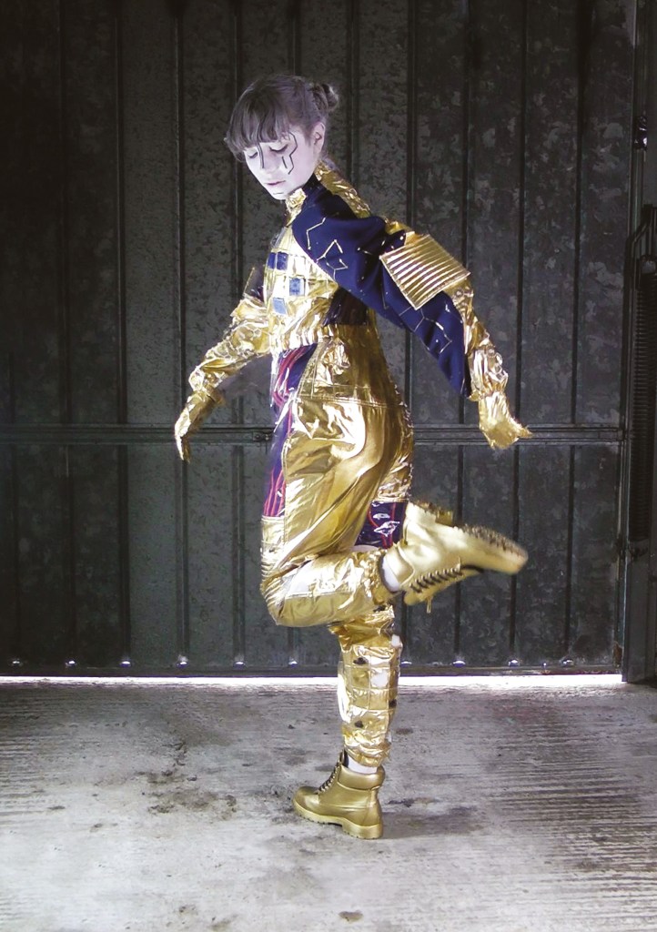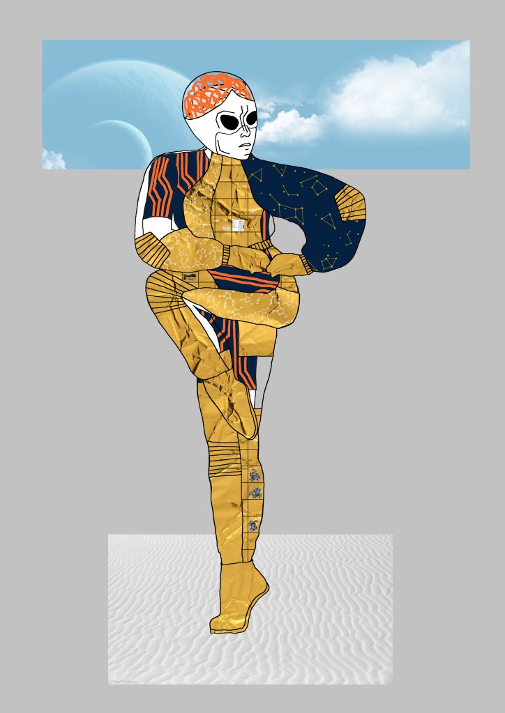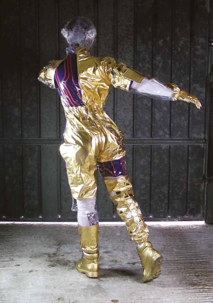 For this project from the 3rd year of my degree, we had to create an original conceptual character around the theme of “migration”. I chose to design a human-alien hybrid from the future, travelling from a dystopian and decaying Earth to find a new home on a new planet. My character has to carry all that she needs within her spacesuit: blueprints, maps, medications, seeds and technology. I pattern cut, screen printed, embroidered, piped, quilted and constructed this costume myself. 2016 – 2017.