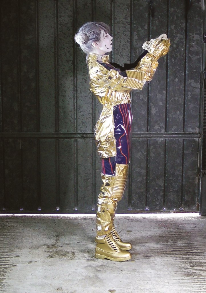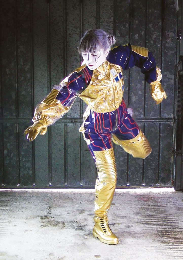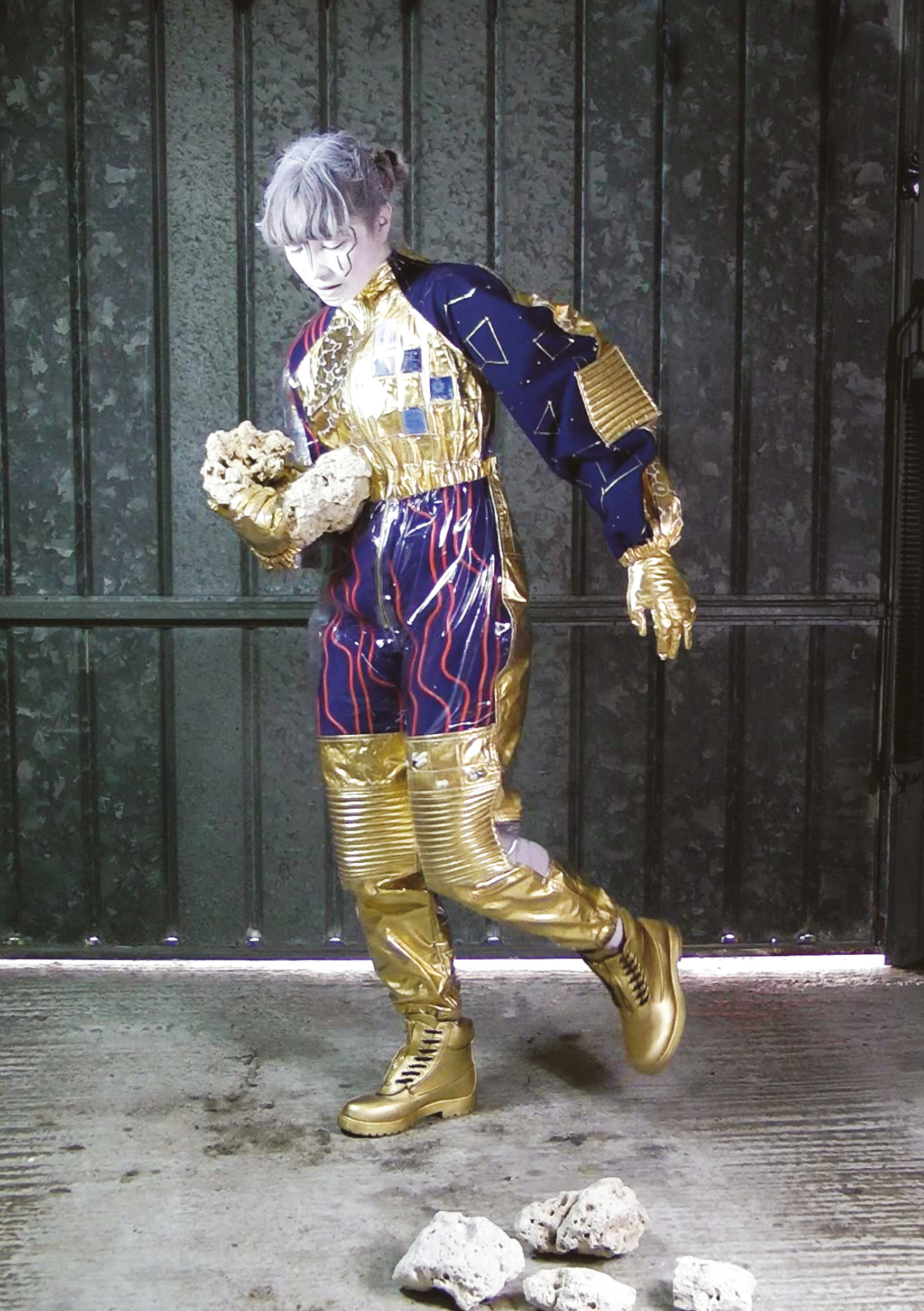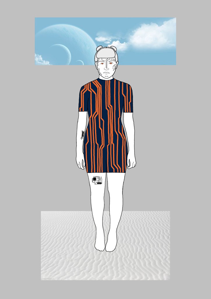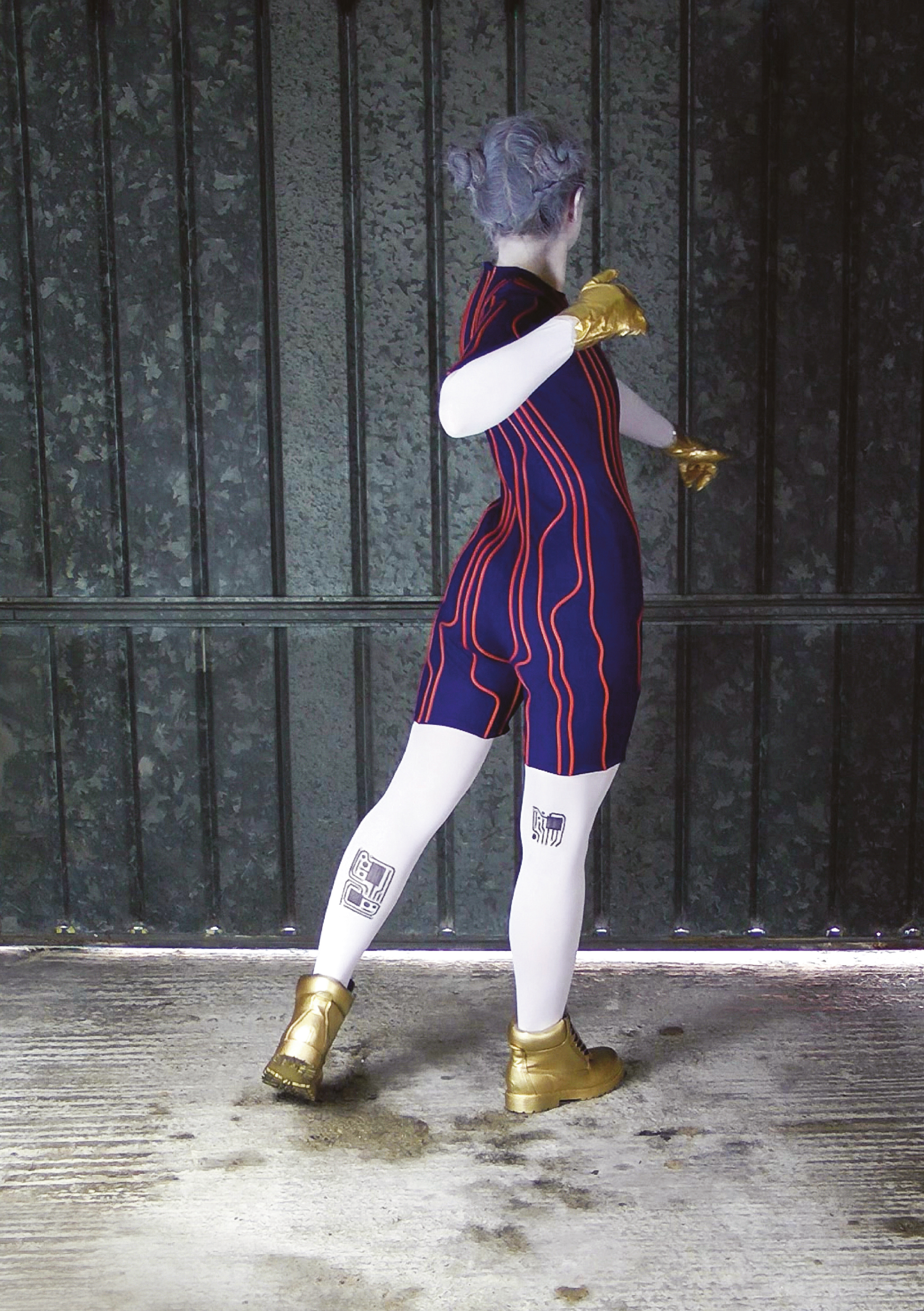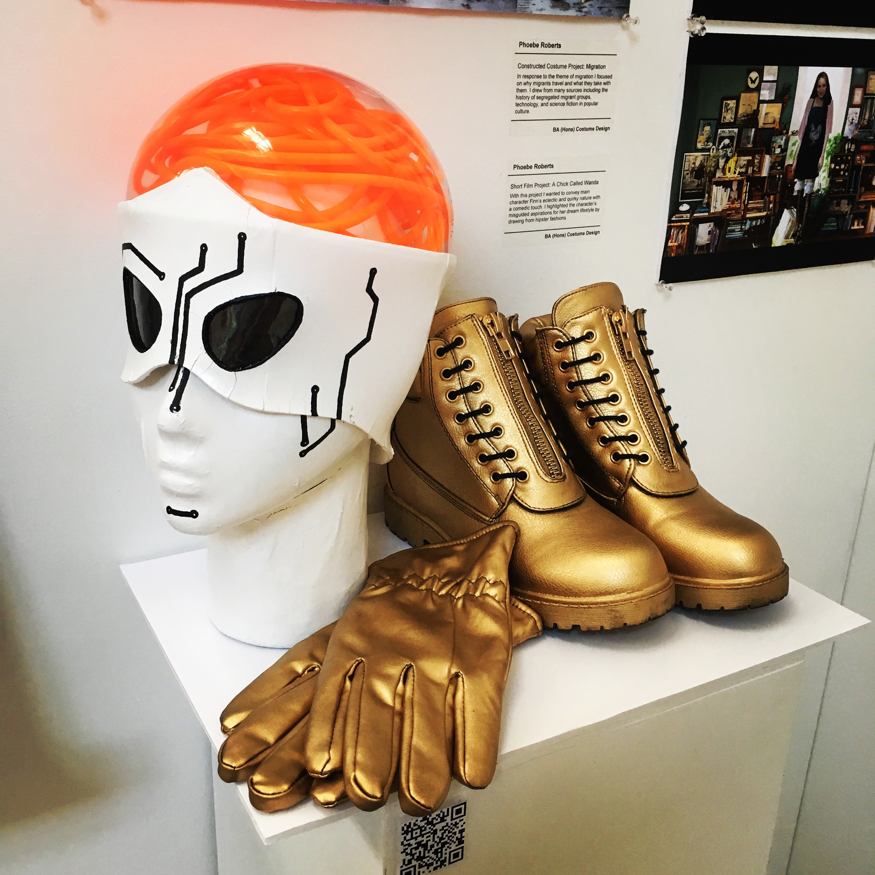 For this project from the 3rd year of my degree, we had to create an original conceptual character around the theme of “migration”. I chose to design a human-alien hybrid from the future, travelling from a dystopian and decaying Earth to find a new home on a new planet. My character has to carry all that she needs within her spacesuit: blueprints, maps, medications, seeds and technology. I pattern cut, screen printed, embroidered, piped, quilted and constructed this costume myself. 2016 – 2017.