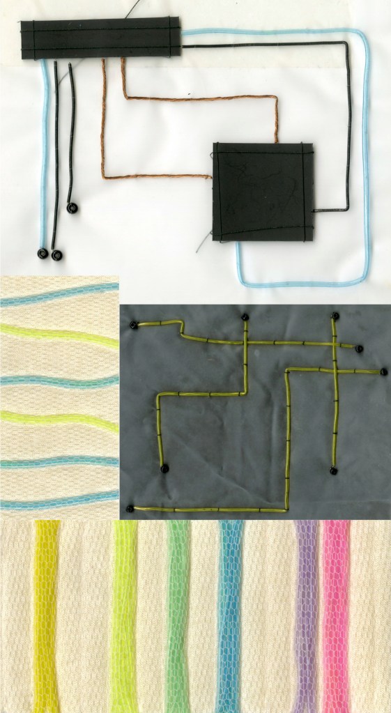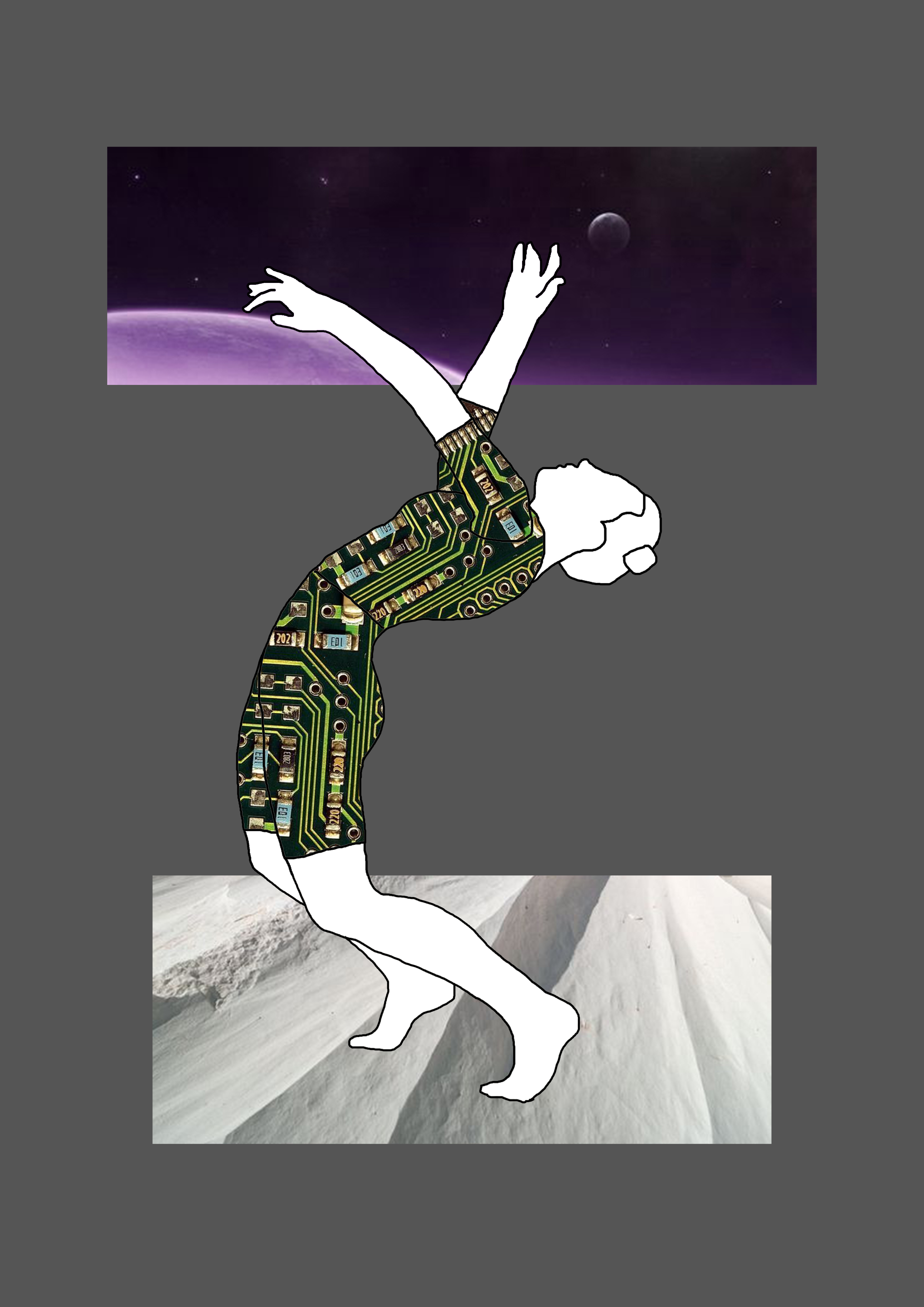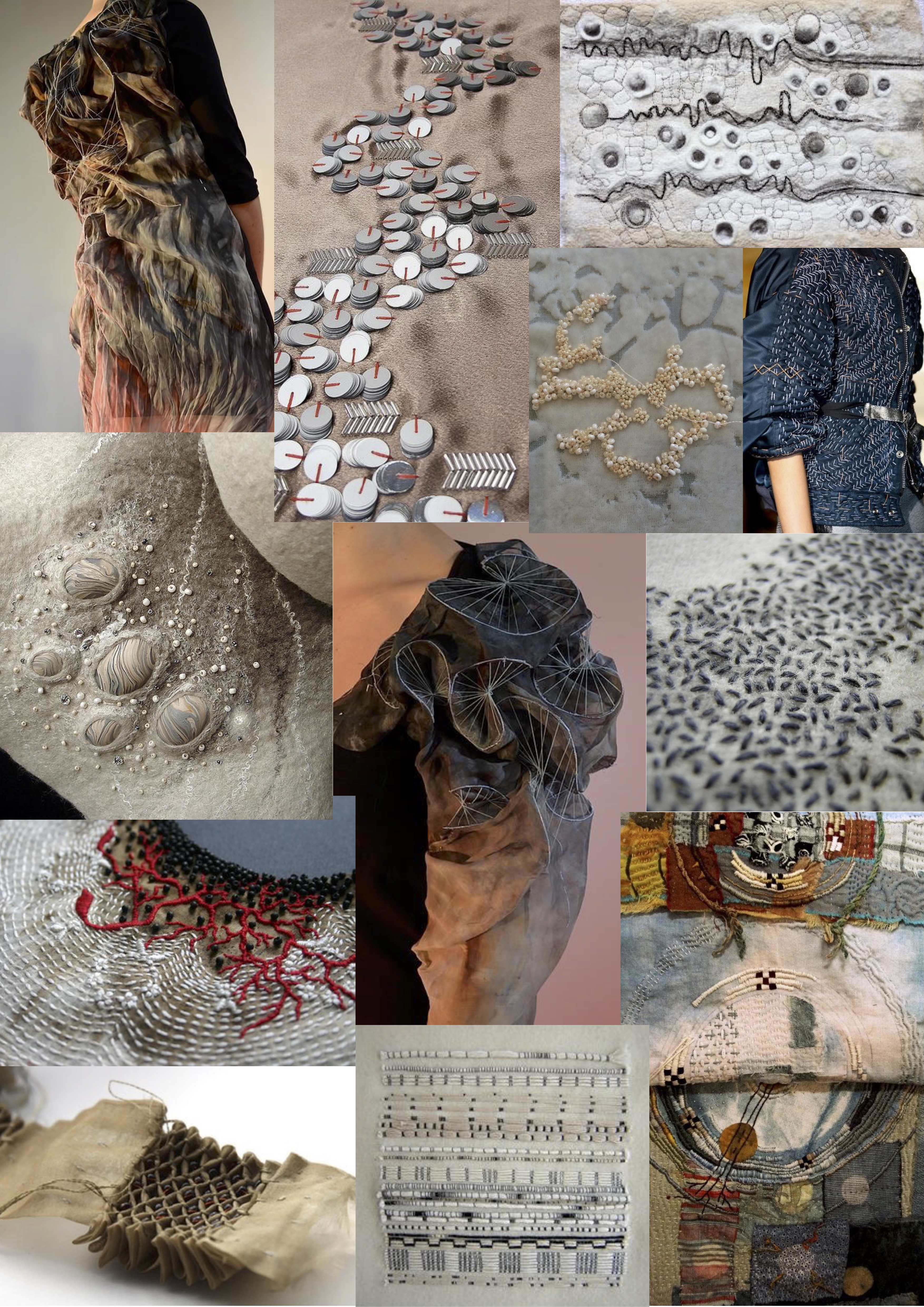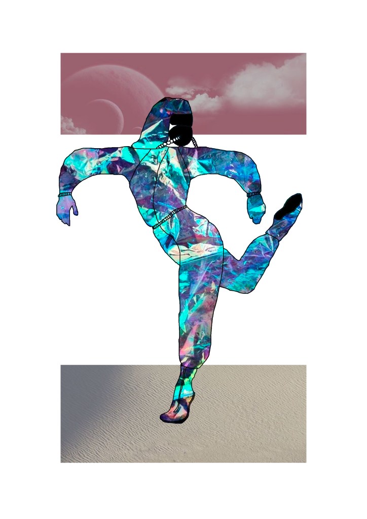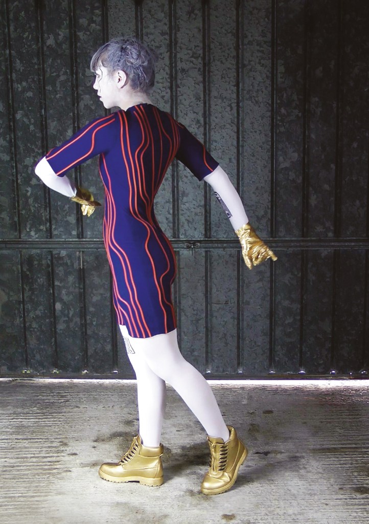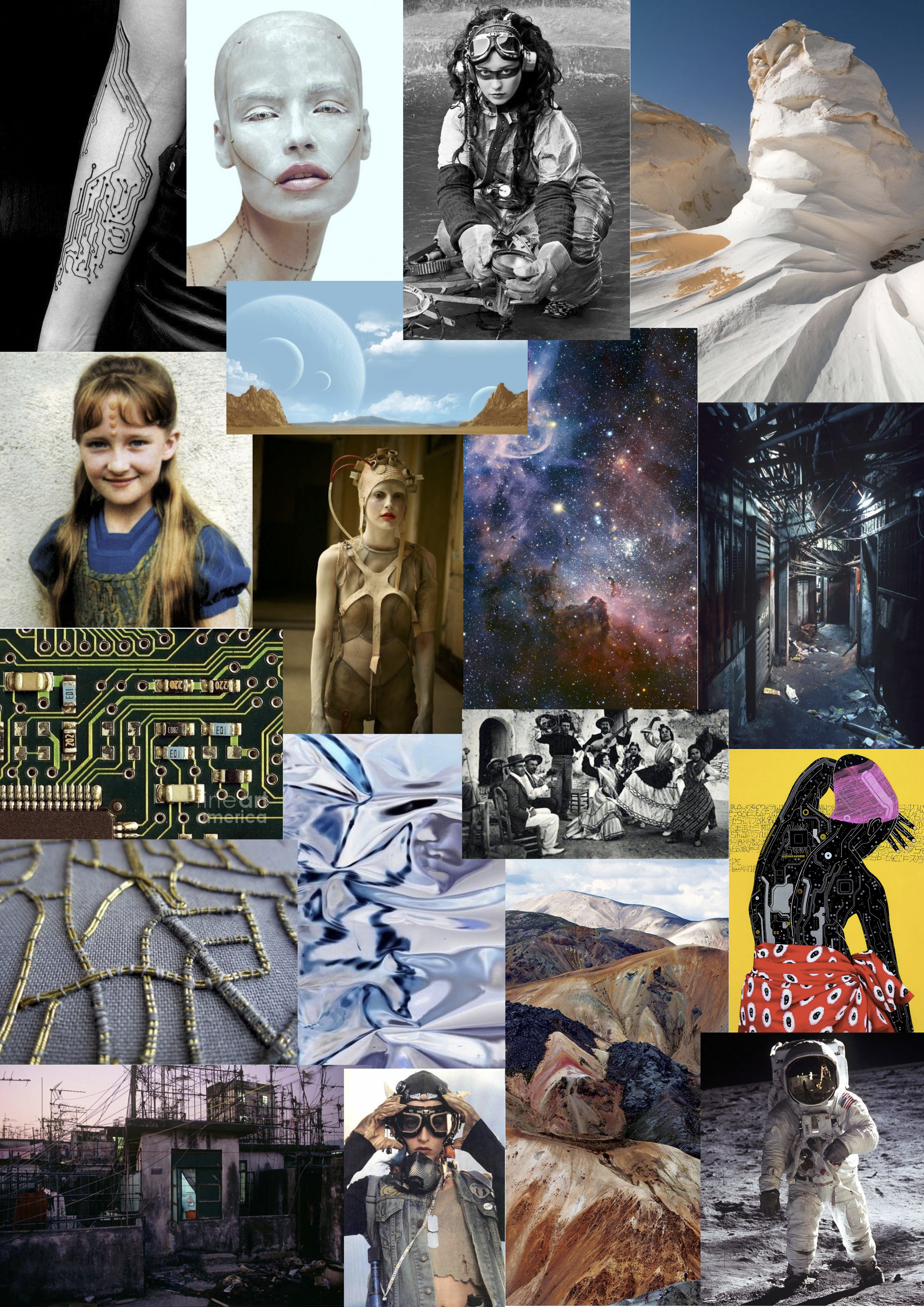 For this project from the 3rd year of my degree, we had to create an original conceptual character around the theme of “migration”. I chose to design a human-alien hybrid from the future, travelling from a dystopian and decaying Earth to find a new home on a new planet. My character has to carry all that she needs within her spacesuit: blueprints, maps, medications, seeds and technology. I pattern cut, screen printed, embroidered, piped, quilted and constructed this costume myself. 2016 – 2017.