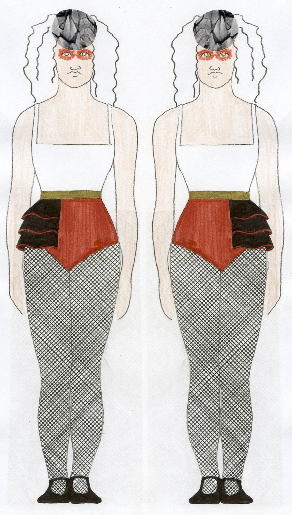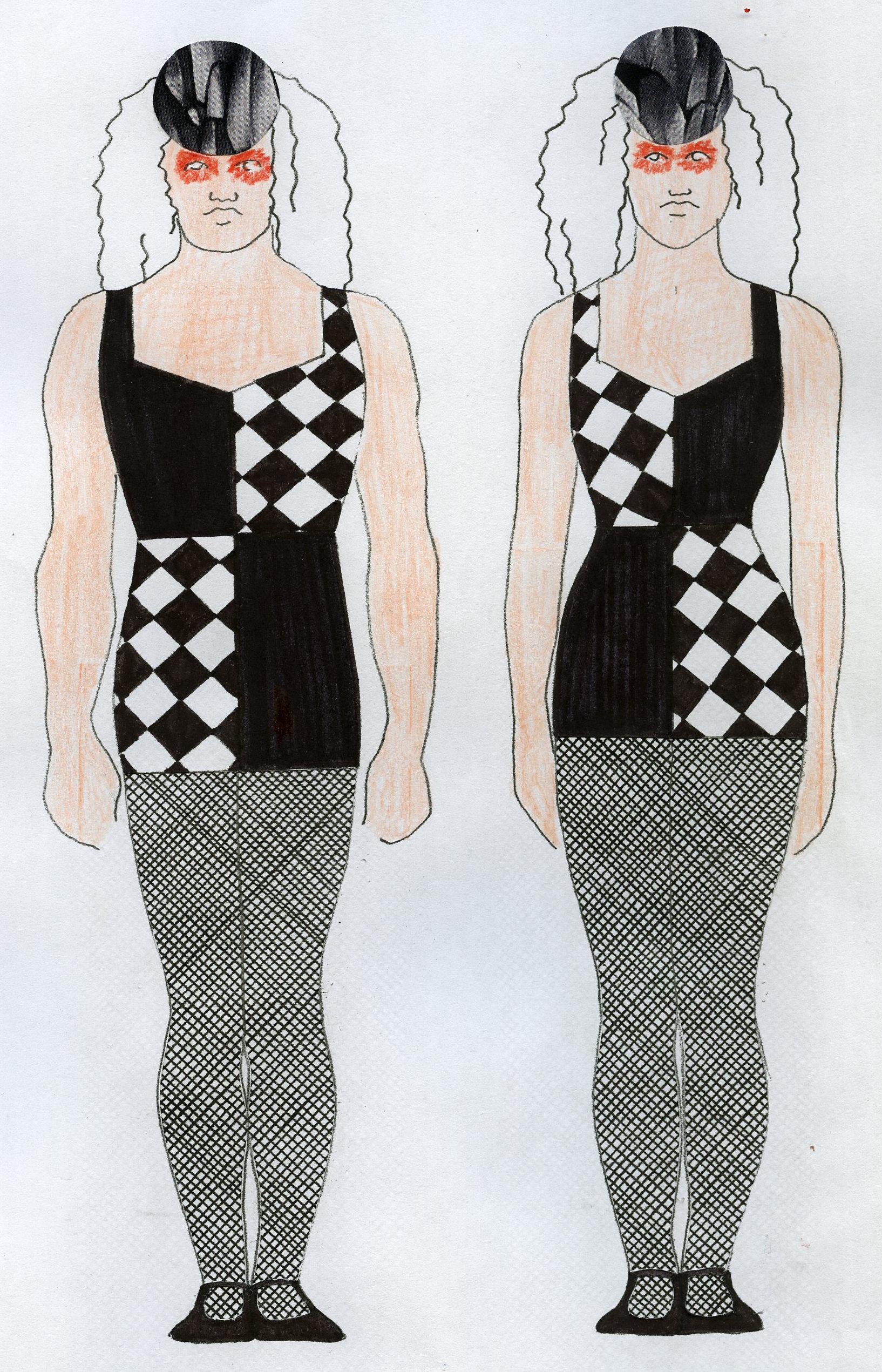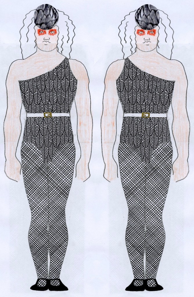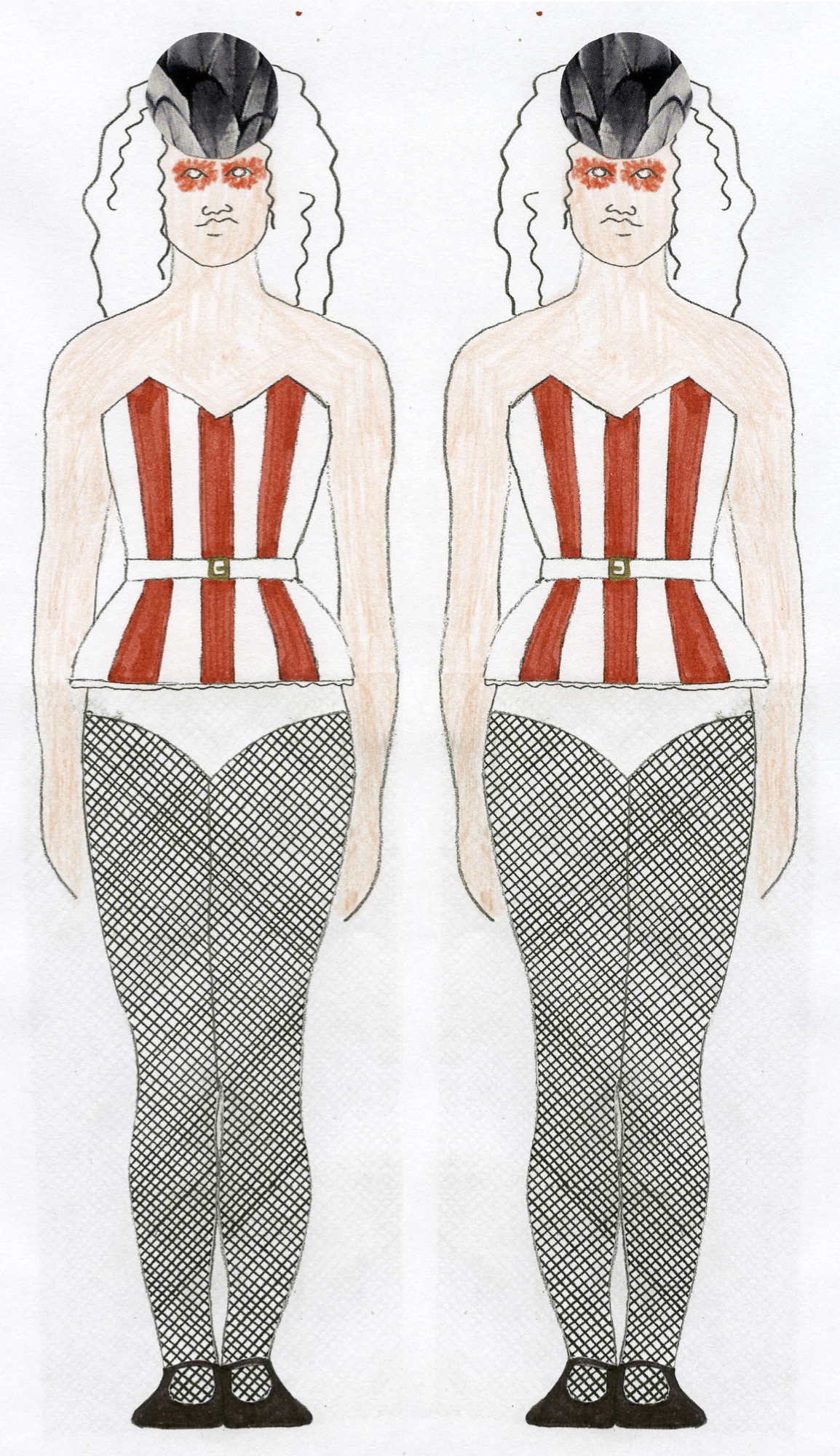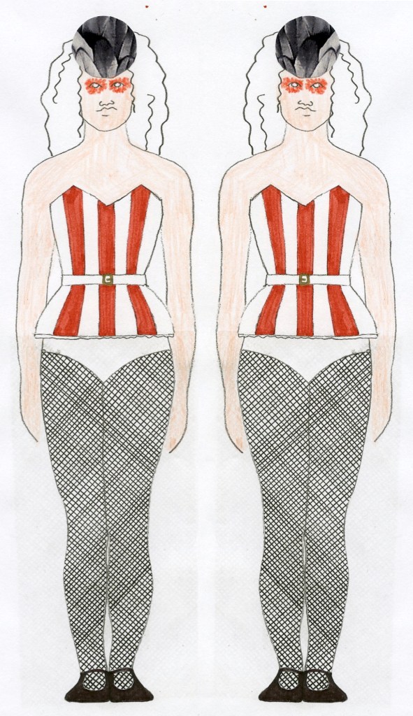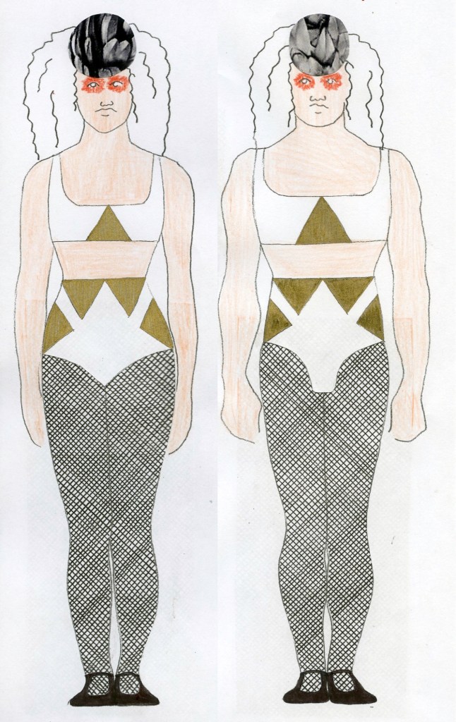 For this project from the 1st year of my degree, we had to design costumes for pairs of circus performers, in a dance piece recreating shots from Alfred Hitchcock’s The Birds. My first set of designs used traditional contemporary dance garments, with pleated fabric inspired by Indian dace costumes. The colours, fabric texture, print and placing of the pleated sections were intended to imitate birds. For the second set of designs, I was directed to go for a ‘sleazy circus’ feel and so I reinterpreted traditional circus costumes for modern dance wear. 2015.