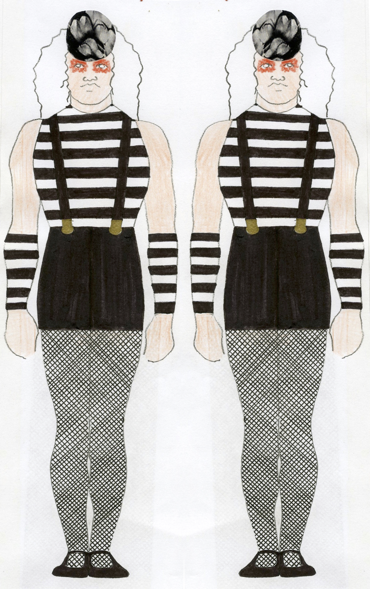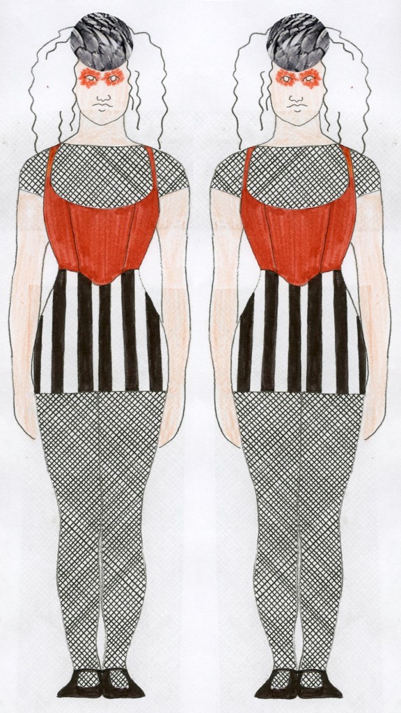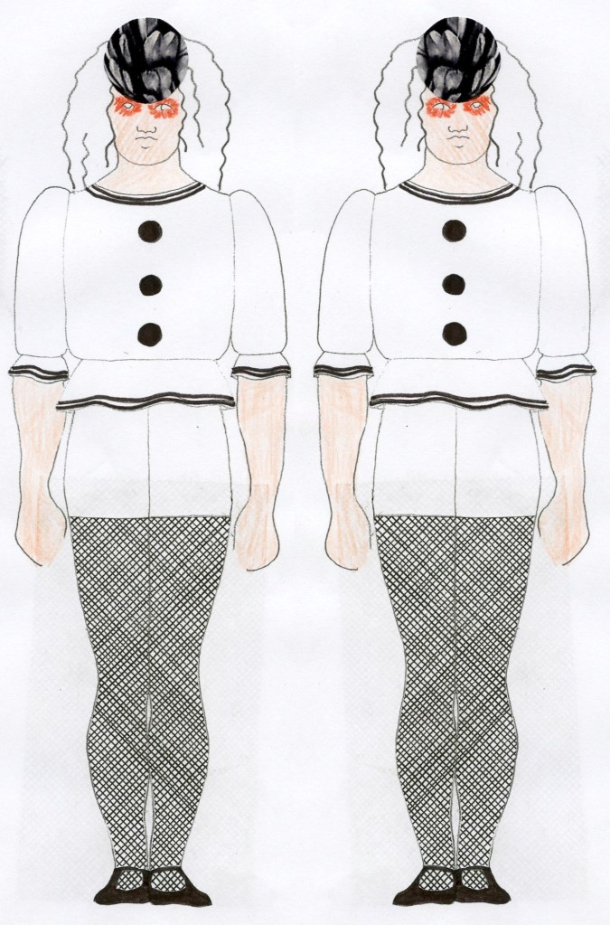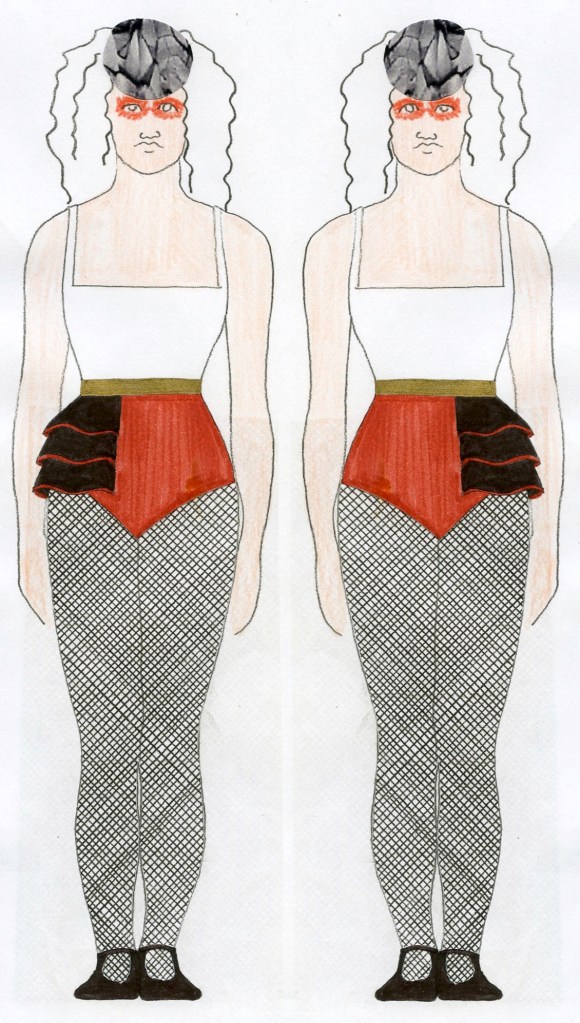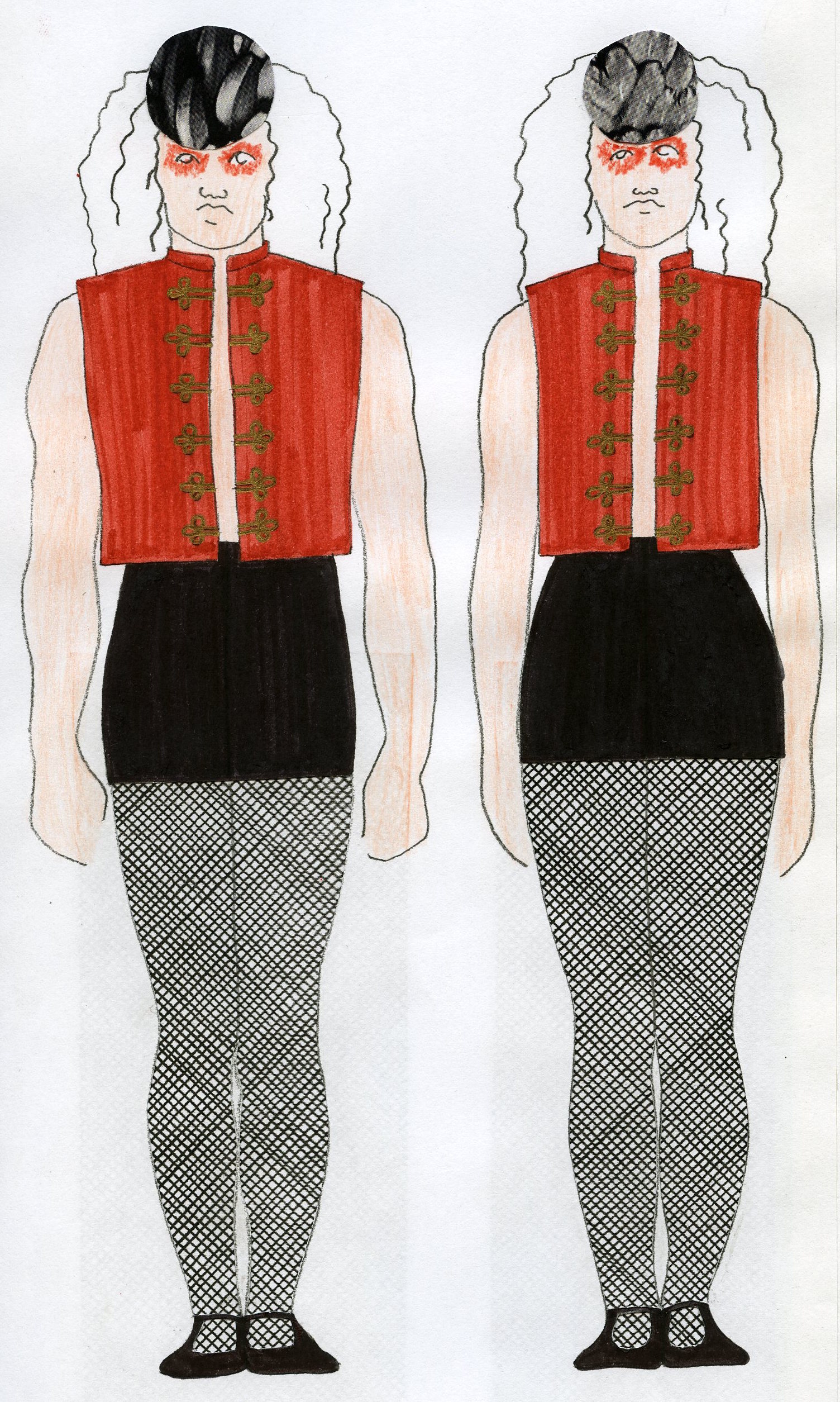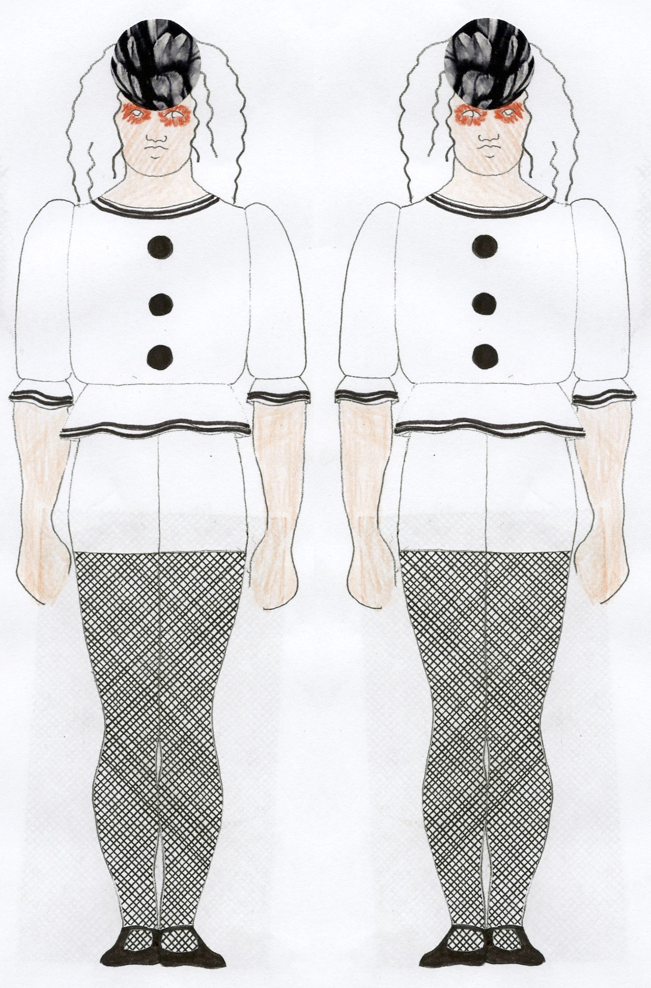 For this project from the 1st year of my degree, we had to design costumes for pairs of circus performers, in a dance piece recreating shots from Alfred Hitchcock’s The Birds. My first set of designs used traditional contemporary dance garments, with pleated fabric inspired by Indian dace costumes. The colours, fabric texture, print and placing of the pleated sections were intended to imitate birds. For the second set of designs, I was directed to go for a ‘sleazy circus’ feel and so I reinterpreted traditional circus costumes for modern dance wear. 2015.