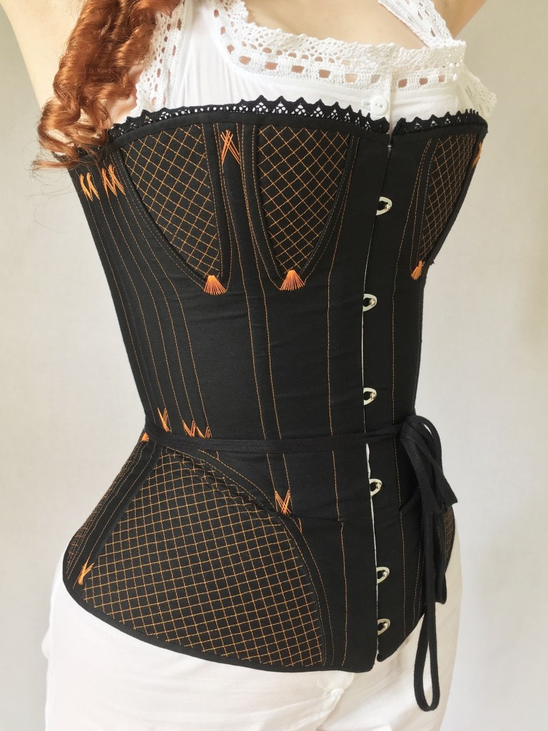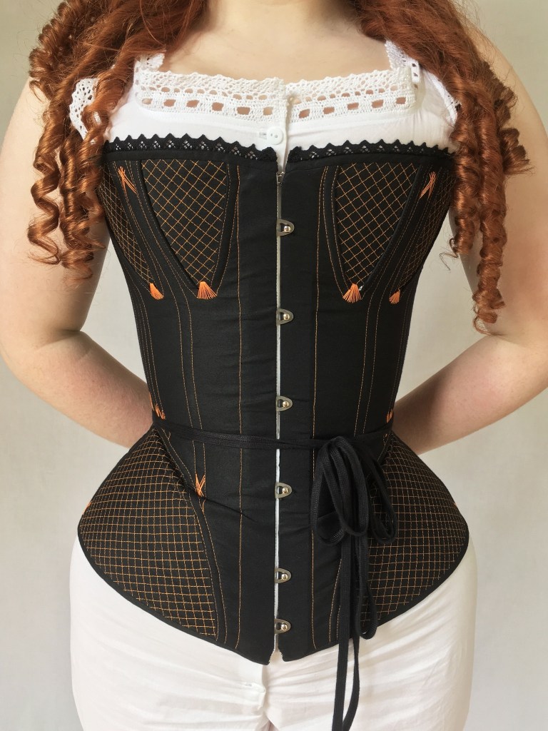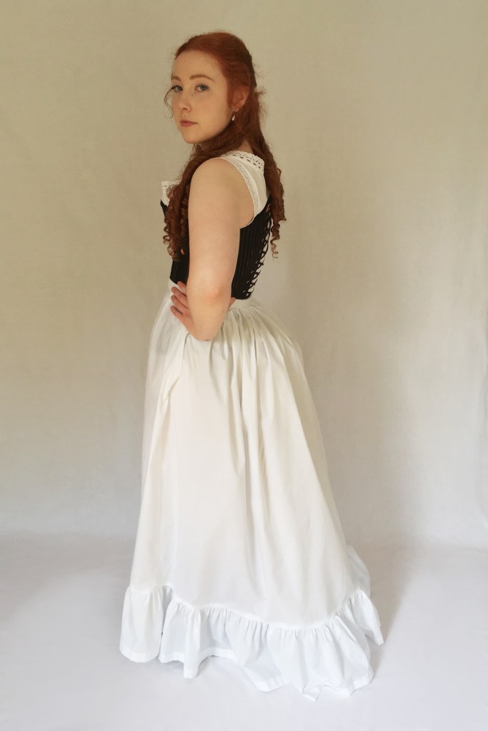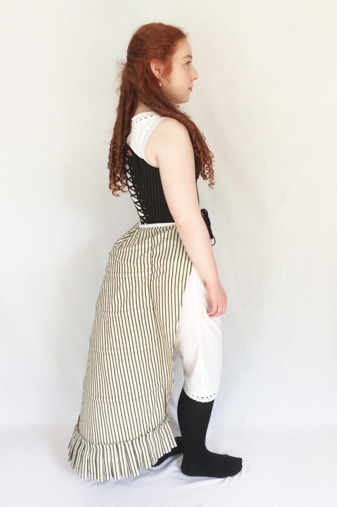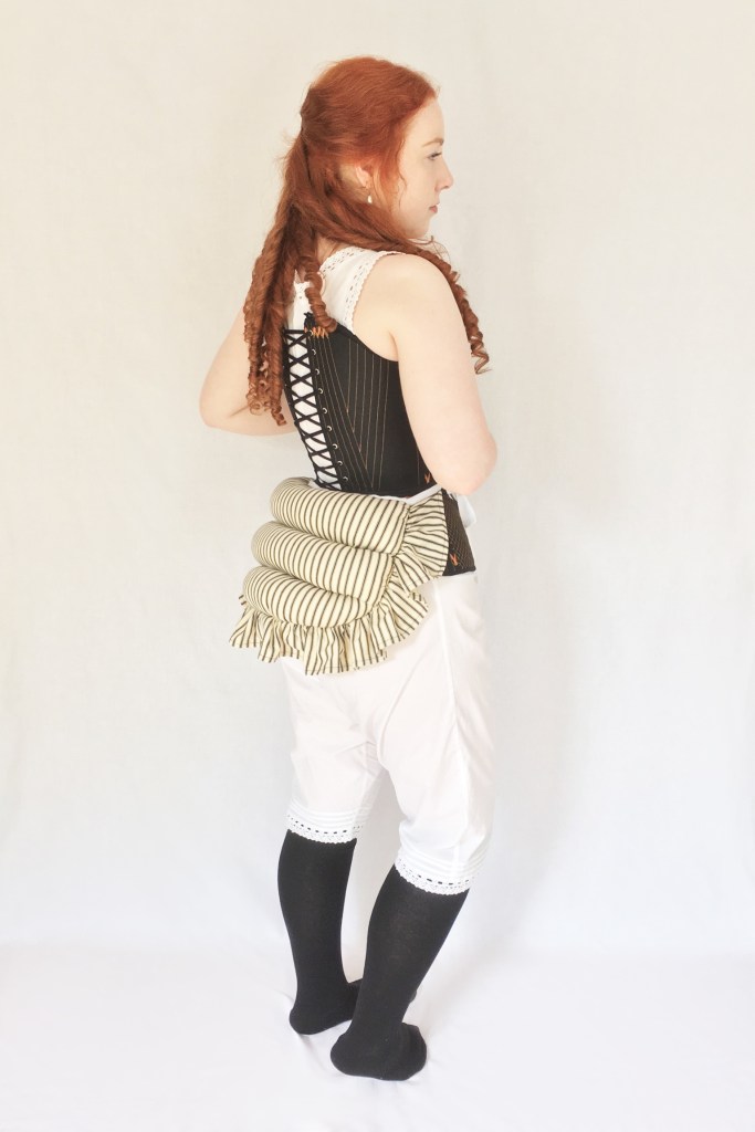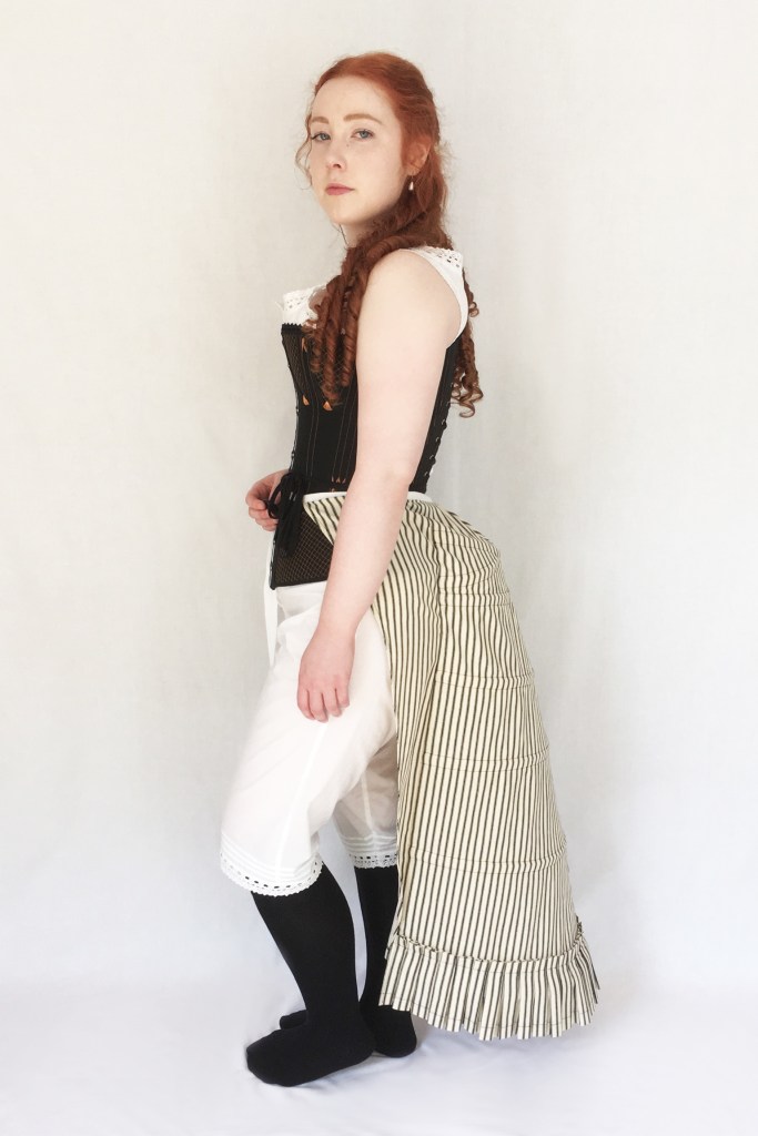 This Victorian corset is based on two very similar extant examples from the late 19th Century. Though the corsets are from slightly different style eras, the 1870s and 1890s, they are almost identical in design. To complete a set of early 1870s underwear I made cotton combinations, a lobster bustle, a bustle pad, and a ruffled petticoat. 2017 – 2018.